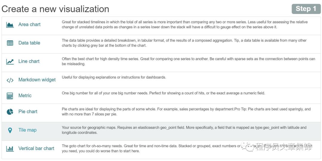 Visualize 标签页用来对索引数据设计可视化的图表。在此标签中,可保存可视化图表,方便加载合并到dashboard面板里。点击visualize标签创建一个新的可视化标签,可选的有Area chart(区块图)、Data table(数据表)、Line chart(折线图)、Metric(计算器)、Pie chart(饼图)、Tile map(地理位置)、Vertical bar chart(直方图)。
