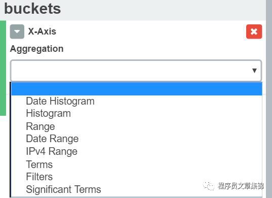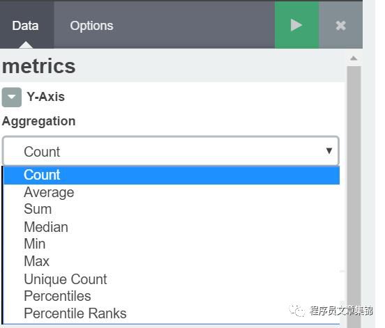 l Percentile percentile聚合返回一个数值字段中值的百分比分布。从下拉菜单选择一个字段,然后在Percentiles框内指定范围。点击X移除一个百分比框,点击+Add添加一个百分比框。