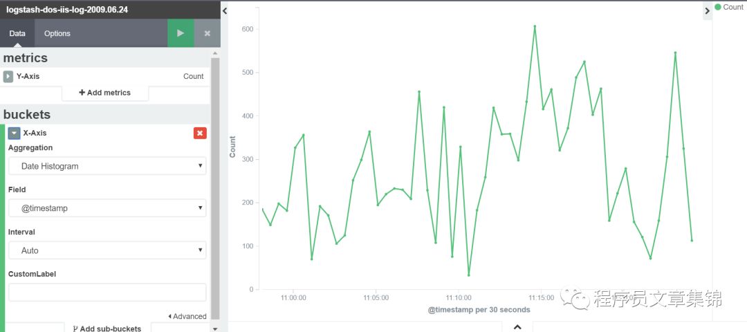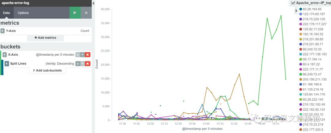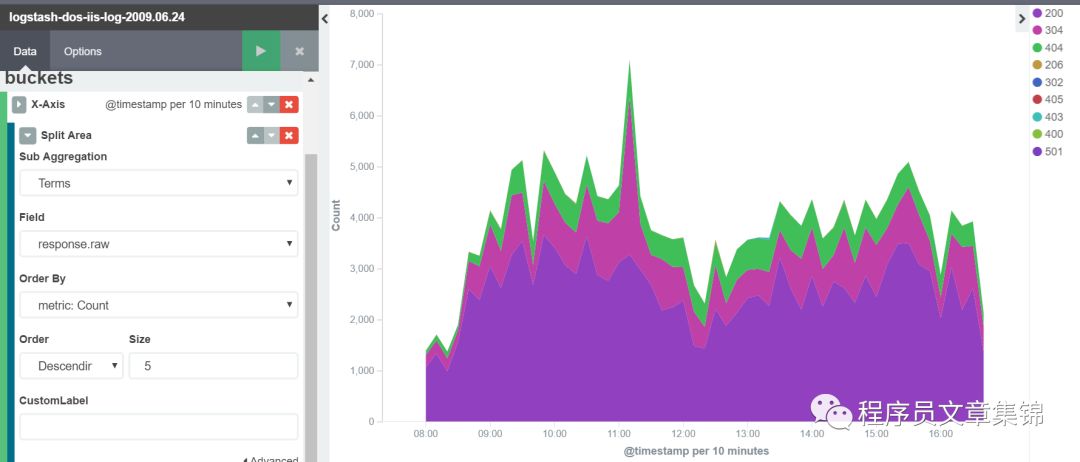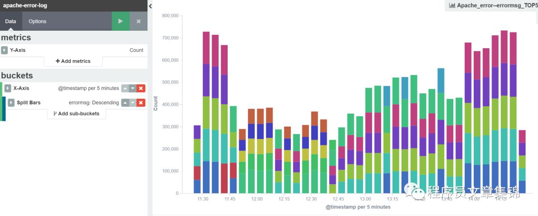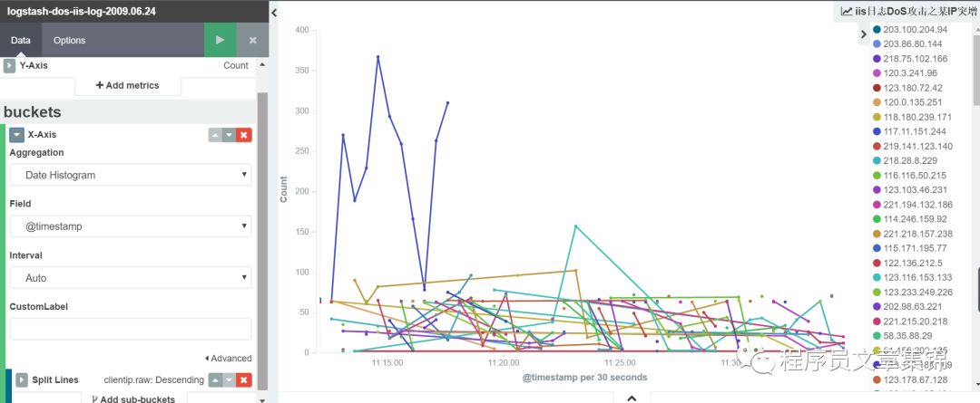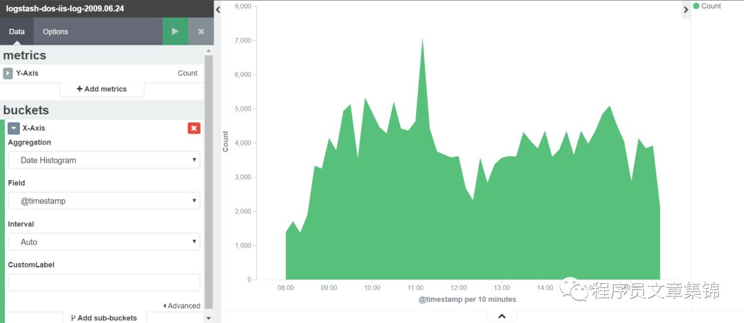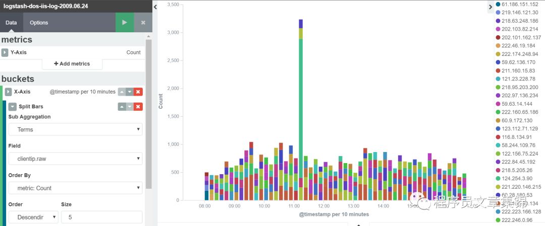 1直方图的 Y 轴是数值维度,图形的 X 轴是buckets 维度。类似折线图,可以选择字段用terms、filters等过滤。
