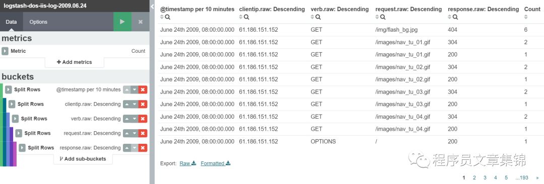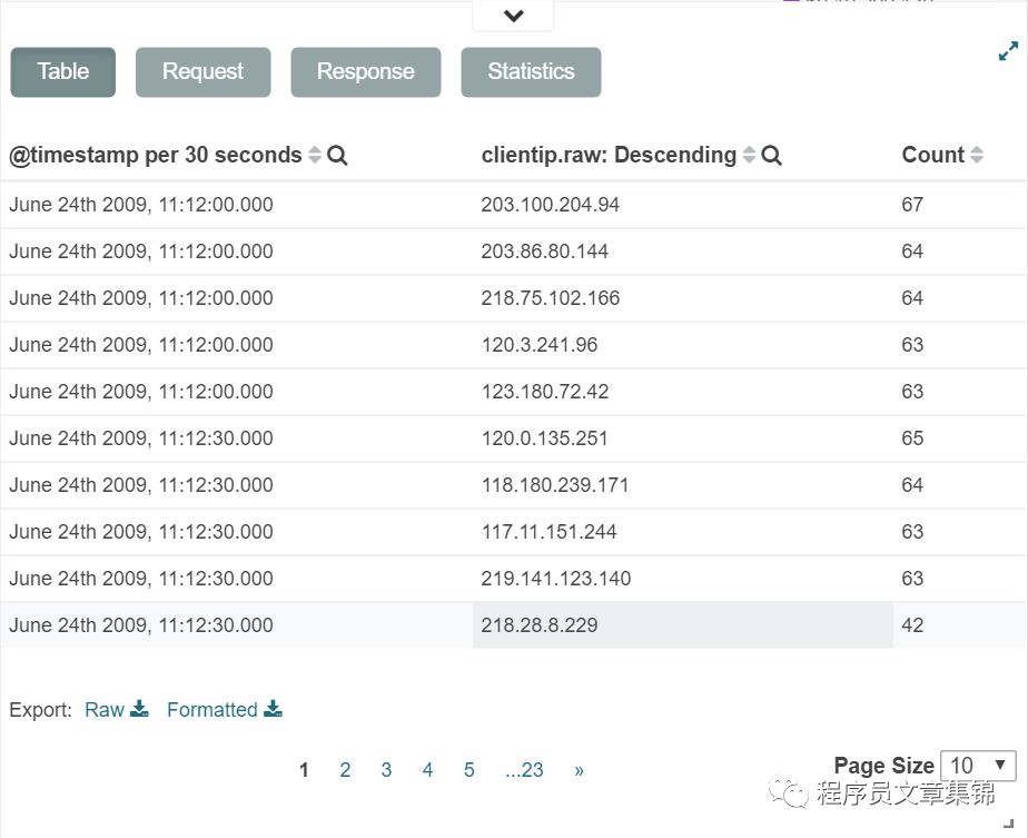 要显示可视化背后的原始数据,点击容器底部的。可视化会被有关原始数据详细信息的几个标签替换掉。底层数据的分页展示。可以通过点击每列顶部的方式给该列数据排序。