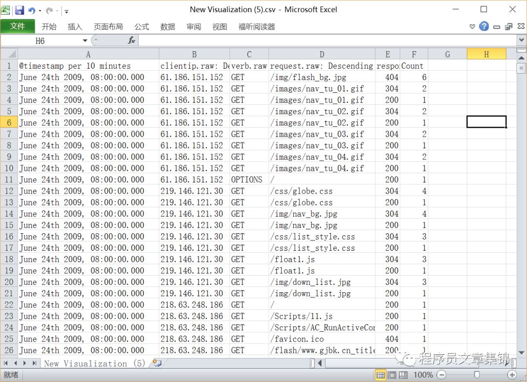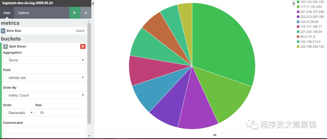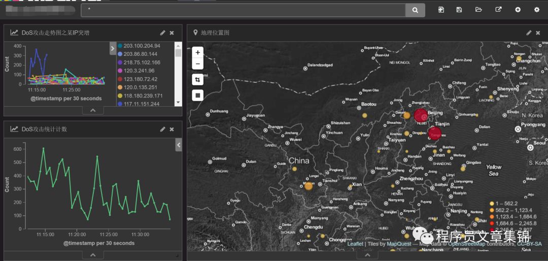 第三步,进入visualize标签中,做出iis 日志计数图;iis日志中clientip排名靠前的前5位,可以从图中某ip突增,可能存在DoS攻击;iis日志中ip的地理位置。把它们分别起个名字保存起来。