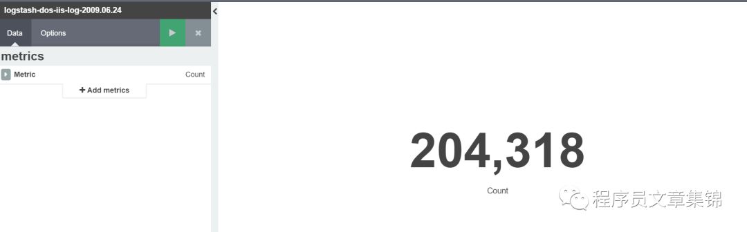 第二步,在kibana的discover标签中左侧选择目标索引,同时选择合适的时间过滤器,就可以看到数据。将其放大以合适的度量显示。