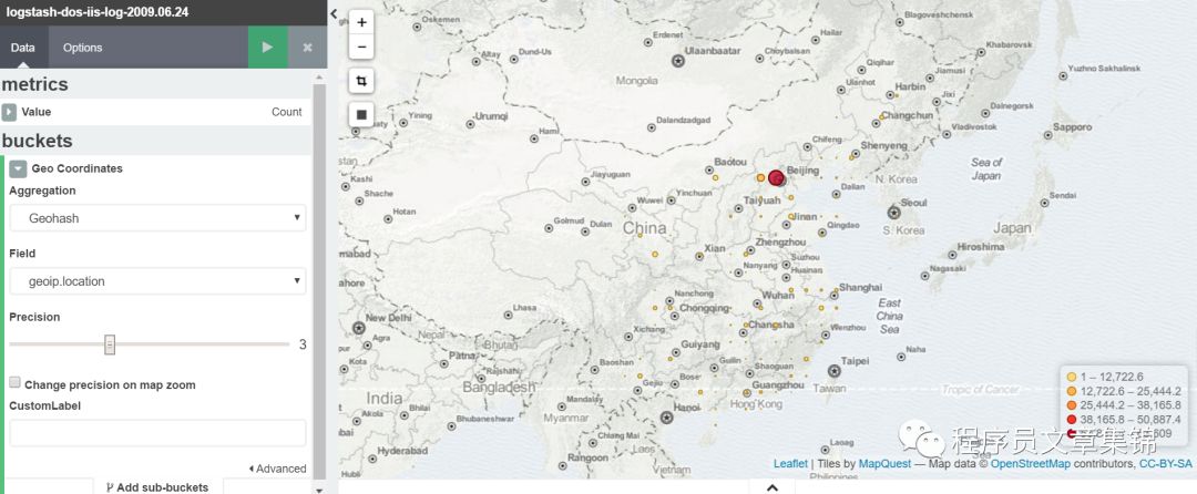 3Maximum zoom: Kibana 的 Tilemap 支持 18 级缩放。该选项设置热力图最大强度下的最高缩放级别。