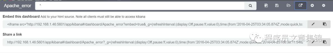 用户必须有 Kibana 的访问权限才能看到嵌入的仪表板。点击 Share 按钮显示 HTML 代码,就可以嵌入仪表板到其他网页里。还带有一个指向仪表板的链接。点击复制按钮可以复制代码,或者链接到你的黏贴板。