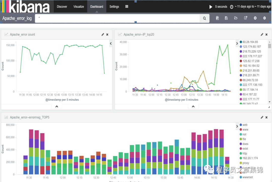 第三步,进入visualize标签中,做出apache错误日志计,apache错误日志中clientip排名靠前的前5位,apache错误日志中errormsg排名靠前的前5位。把它们分别起个名字保存起来。