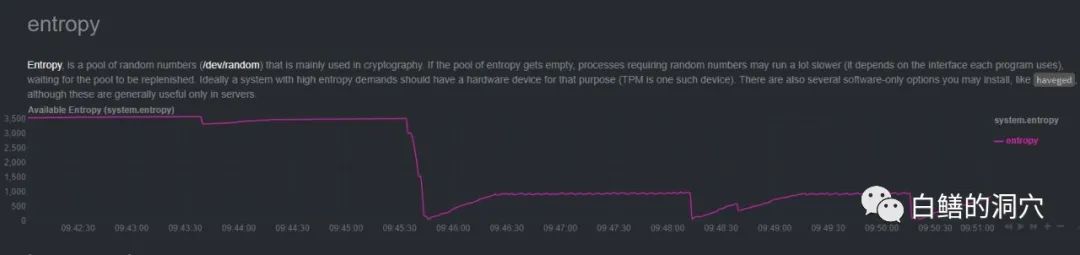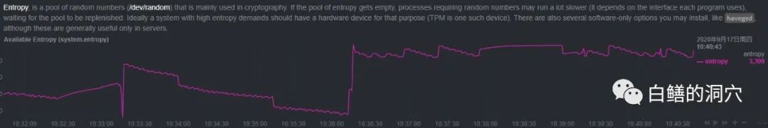 从内核资源分析中,我们很快就定位到了entropy存在周期性的波动情况,于是开始分析熵,以及熵池不足可能的现象。正好这一现象和我们观察到的系统周期性卡顿现象十分一致。