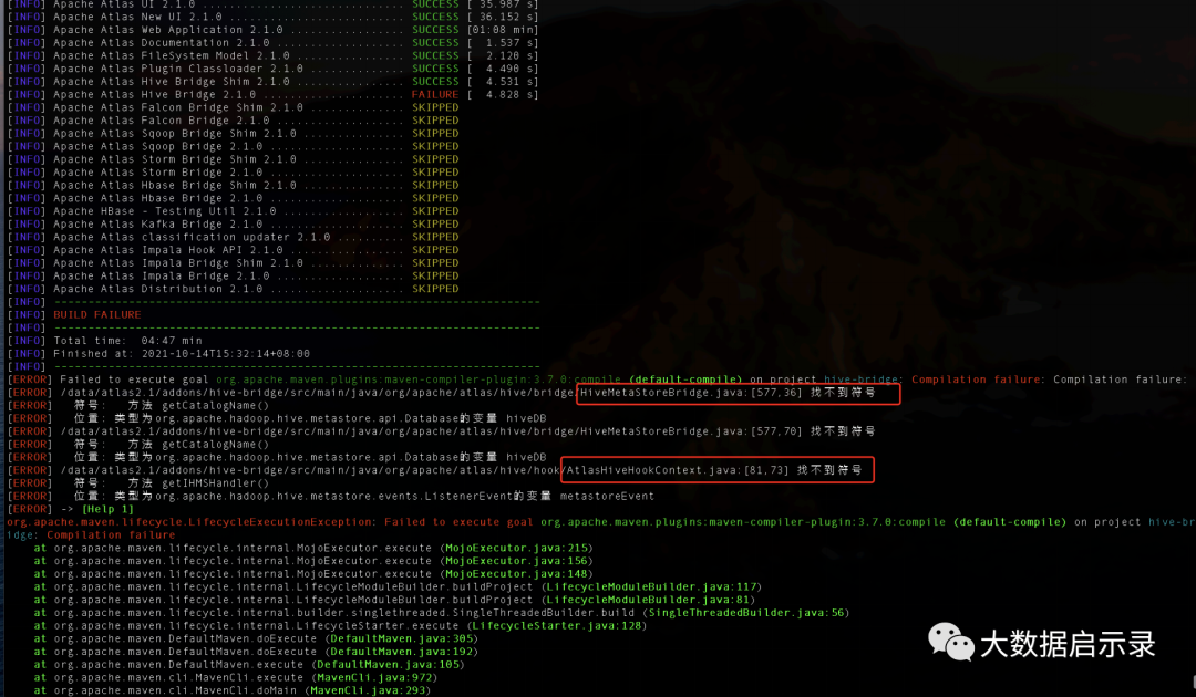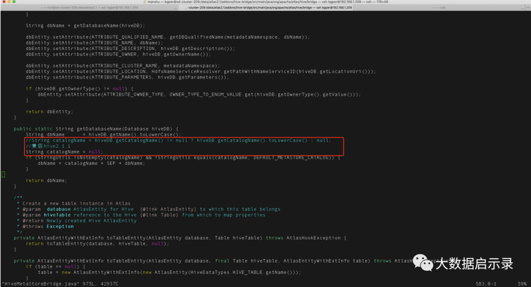 子工程apache-atlas-sources-2.1.0\addons\hive-bridgeorg/apache/atlas/hive/bridge/HiveMetaStoreBridge.javaString catalogName = hiveDB.getCatalogName() != null ? hiveDB.getCatalogName().toLowerCase() : null;改为:String catalogName = null;