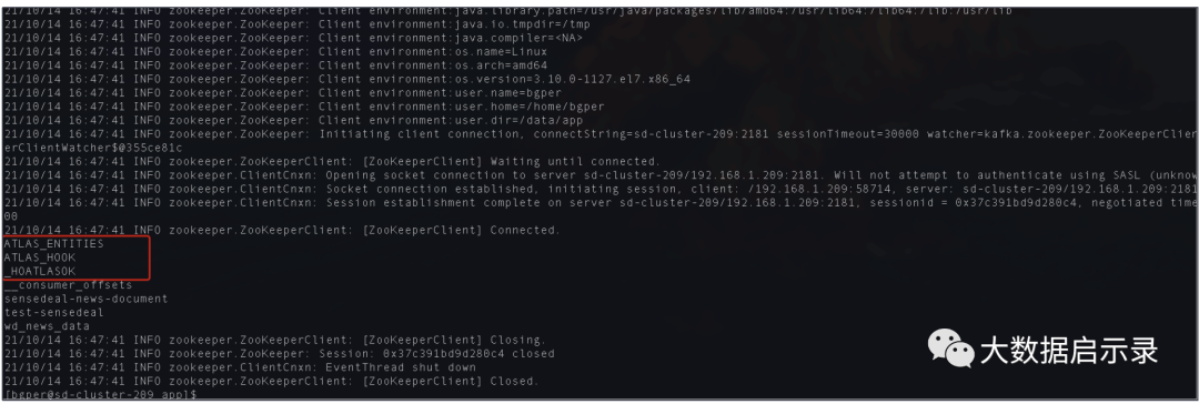 # 配置文件vim /data/app/atlas2.1/conf/atlas-application.properties# 配置项atlas.notification.embedded=false(如果要使用内嵌的kafka,则需改为true)atlas.kafka.zookeeper.connect=sd-cluster-207:2181,sd-cluster-208:2181,sd-cluster-209:2181atlas.kafka.bootstrap.servers=sd-cluster-207:9092,sd-cluster-208:9092,sd-cluster-209:9092atlas.kafka.zookeeper.session.timeout.ms=4000atlas.kafka.zookeeper.connection.timeout.ms=2000atlas.kafka.enable.auto.commit=trueatlas.kafka.offsets.topic.replication.factor=3kafka-topics --zookeeper sd-cluster-209:2181 --create --replication-factor 3 --partitions 3 --topic _HOATLASOKkafka-topics --zookeeper sd-cluster-209:2181 --create --replication-factor 3 --partitions 3 --topic ATLAS_HOOKkafka-topics --zookeeper sd-cluster-209:2181 --create --replication-factor 3 --partitions 3 --topic ATLAS_ENTITIESkafka-topics.sh --list --zookeeper sd-cluster-209:2181