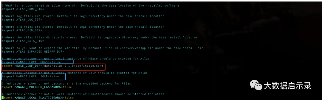 # 配置文件vim /data/app/atlas2.1/conf/atlas-application.properties# 配置项atlas.graph.storage.hostname=sd-cluster-207:2181,sd-cluster-208:2181,sd-cluster-209:2181# 将hbase的配置文件软连接到Atlas的conf的hbase目录下ln -s /etc/hbase/conf/ /data/app/atlas2.1/conf/hbase/# 配置文件vim /data/app/atlas2.1/conf/atlas-env.shexport HBASE_CONF_DIR=//data/app/atlas2.1/conf/hbase/conf