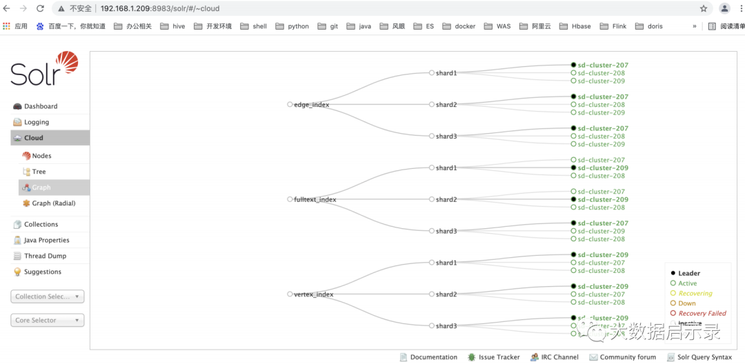 # 配置文件vim /data/app/atlas2.1/conf/atlas-application.properties# 配置项atlas.graph.index.search.solr.zookeeper-url=sd-cluster-207:2181/solr,sd-cluster-208:2181/solr,sd-cluster-209:2181/solr# 将Atlas的conf目录下Solr文件夹同步到Solr的目录下并更名cp -r /data/app/atlas2.1/conf/solr/ /opt/cloudera/parcels/CDH/lib/solr/atlas_solr# 同步到其它节点 sd-cluster-207̵sd-cluster-208/opt/cloudera/parcels/CDH/lib/solr/atlas_solr# 修改用户组chown -R solr:solr /opt/cloudera/parcels/CDH/lib/solr/# 切换用户su solr# Solr创建collection/opt/cloudera/parcels/CDH/lib/solr/bin/solr create -c vertex_index -d/opt/cloudera/parcels/CDH/lib/solr/atlas_solr -force -shards 3 -replicationFactor 3/opt/cloudera/parcels/CDH/lib/solr/bin/solr create -c edge_index -d/opt/cloudera/parcels/CDH/lib/solr/atlas_solr -force -shards 3 -replicationFactor 3/opt/cloudera/parcels/CDH/lib/solr/bin/solr create -c fulltext_index -d/opt/cloudera/parcels/CDH/lib/solr/atlas_solr -force -shards 3 -replicationFactor 3