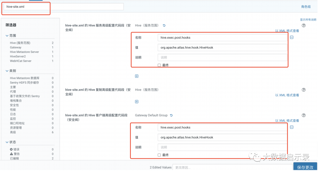 修改【hive-site.xml的Hive服务高级代码段(安全阀)】名称:hive.exec.post.hooks值:org.apache.atlas.hive.hook.HiveHook修改【hive-site.xml的Hive客户端高级代码段(安全阀)】名称:hive.exec.post.hooks值:org.apache.atlas.hive.hook.HiveHook,org.apache.hadoop.hive.ql.hooks.LineageLogger