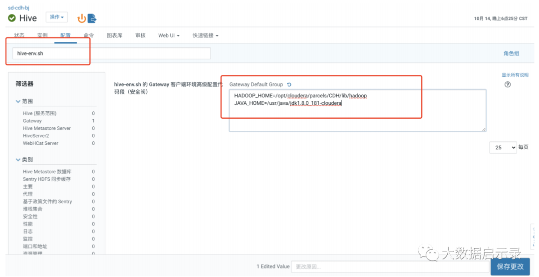 修改【hive-env.sh的Gateway客户端环境高级配置代码段(安全阀)】HADOOP_HOME=/opt/cloudera/parcels/CDH/lib/hadoopJAVA_HOME=/usr/java/jdk1.8.0_181-cloudera