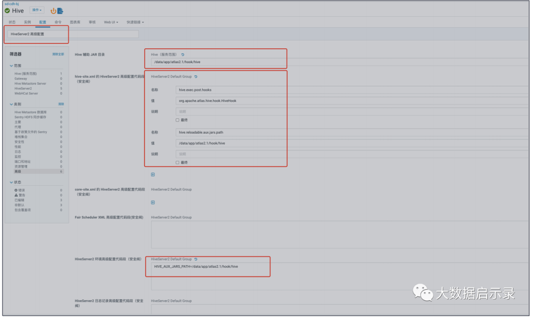 修改【Hive辅助JAR目录】值:/data/app/atlas2.1/hook/hive修改hive-site.xml 的HiveServer2高级配置代码段(安全阀)】名称:hive.exec.post.hooks值:org.apache.atlas.hive.hook.HiveHook,org.apache.hadoop.hive.ql.hooks.LineageLogger名称:hive.reloadable.aux.jars.path值:/data/app/atlas2.1/hook/hive修改【HiveServer2环境高级配置代码段(安全阀)】HIVE_AUX_JARS_PATH=/data/app/atlas2.1/hook/hive