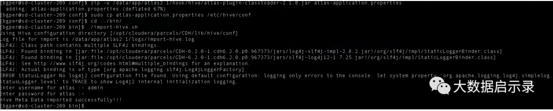 # 切换到Atlas的conf目录下cd /data/atlas-2.1.0/conf# 添加zip -u /data/app/atlas2.1/hook/hive/atlas-plugin-classloader-2.1.0.jar atlasapplication.properties# 将配置文件添加到Hive的配置目录下sudo cp atlas-application.properties /etc/hive/conf# scp到其它主机hive配置下scp atlas-application.properties sd-cluster-207̵sd-cluster-207:/etc/hive/conf
