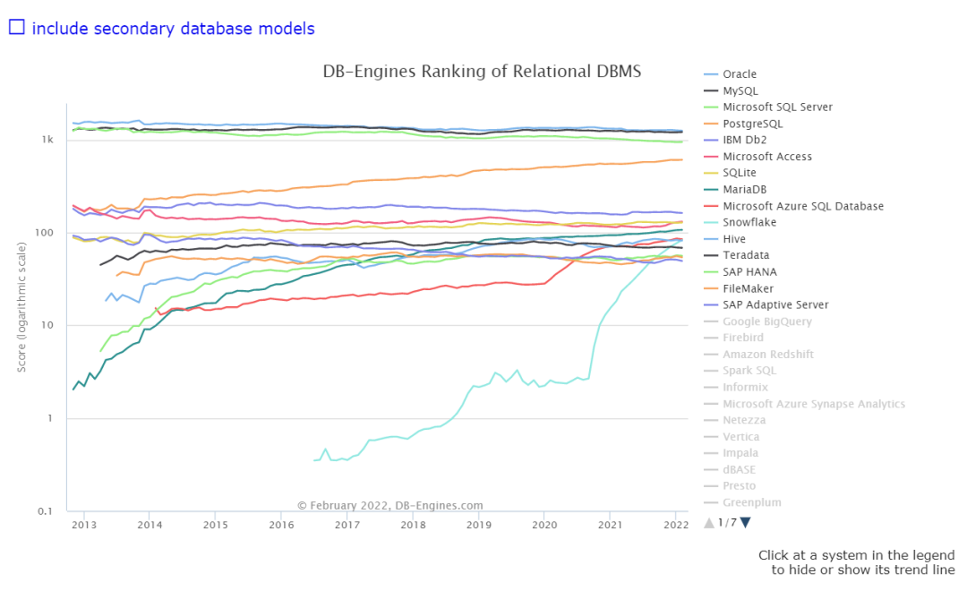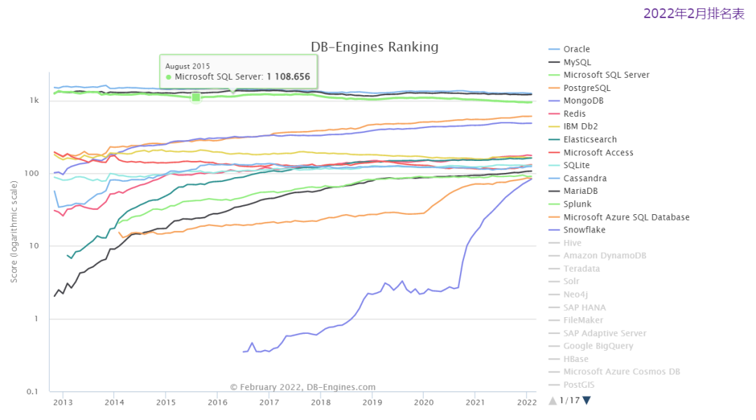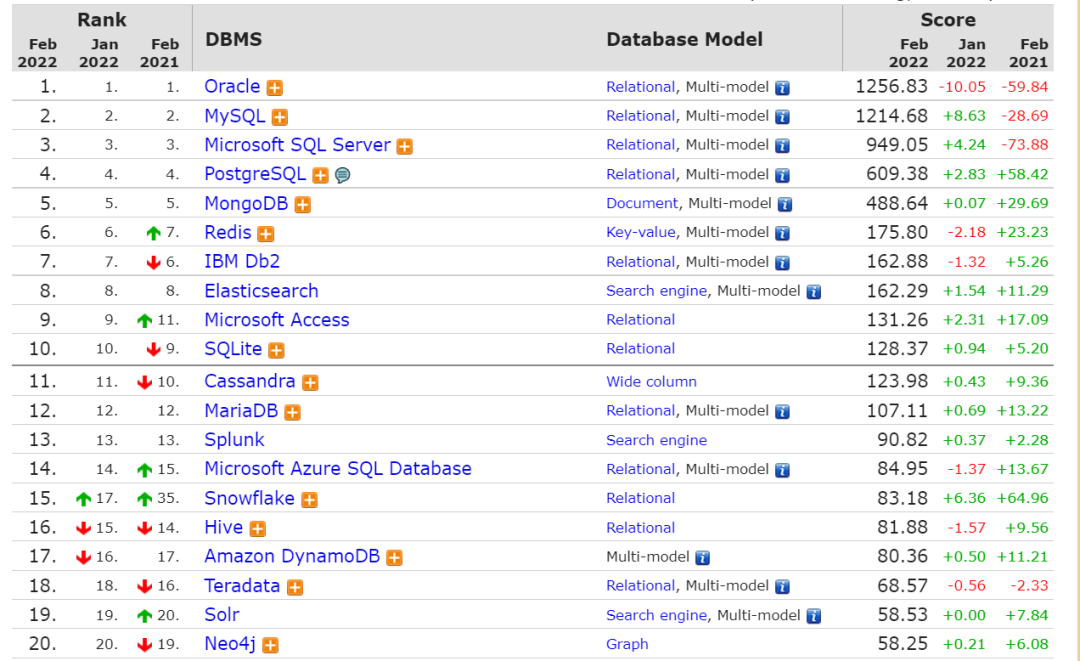 近期,DB-Engines 数据库流行度排行榜发布了 2 月更新,前 20 名基本变化不大。在经过此前持续不断的角逐之后,Snowflake 的排名上升,从上个月的第 17 名上升至现在的第 15 名。分数更是比去年同期增加了 64.96 分。