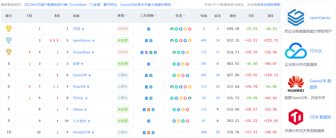 墨天轮也在近期发布了 2022 年 2 月国产数据库排行榜,共有 195 个数据库参与排名。排名前十位的数据库分数增减幅度较大,整体排名略有波动。