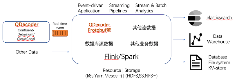 QDecoder启动后,通过IP/PORT连接Oracle数据库,持续不断地获取在线日志,将DDL和insert、update、delete变化实时写入kafka。传输到kafka的Topic数据可以由您的应用程序或者Flink/Spark流数据处理程序通过kafka connector获取,并调用protobuf的java包反解析出DML和DDL变化事件,就可以驱动和触发下游大数据和AI的流式处理。