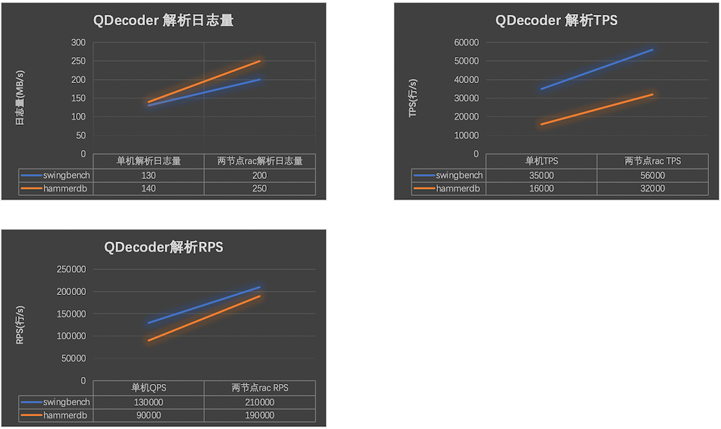 QDecoder单节点日志解析量约为120MB/s,RAC双节点日志解析量为200MB/s