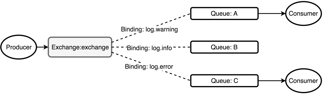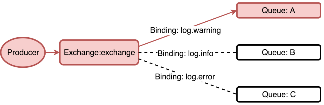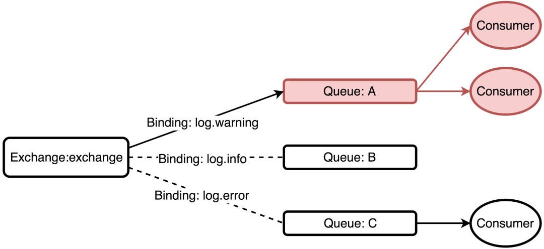 RoutingKey=log.warning,和队列A与交换器的绑定一致,所以消息被路由到了队列A上。