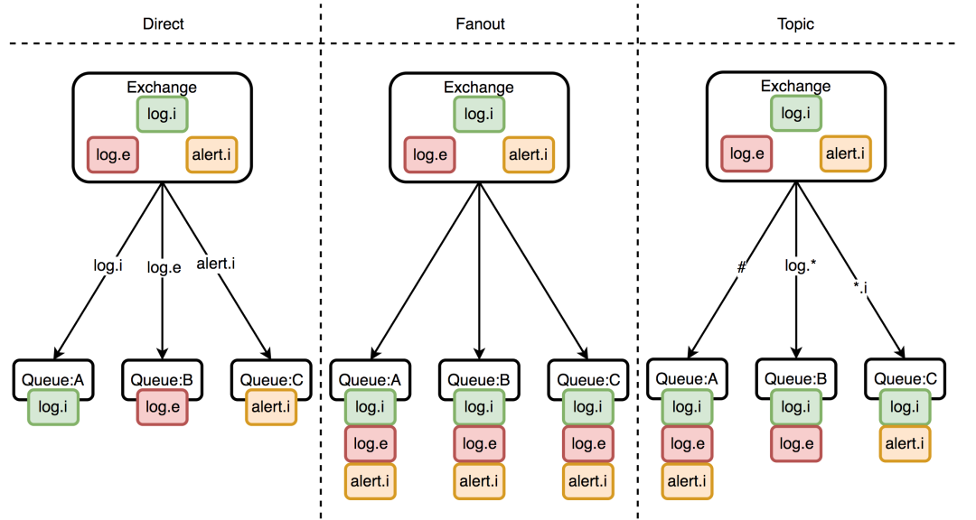 Producer/Consumer:生产者消费者 Exchange:交换器,可以理解为队列的路由逻辑,交换器主要有三种,图中是Direct交换器 Queue:队列 Binding:绑定关系,实际是交换器上映射队列的规则