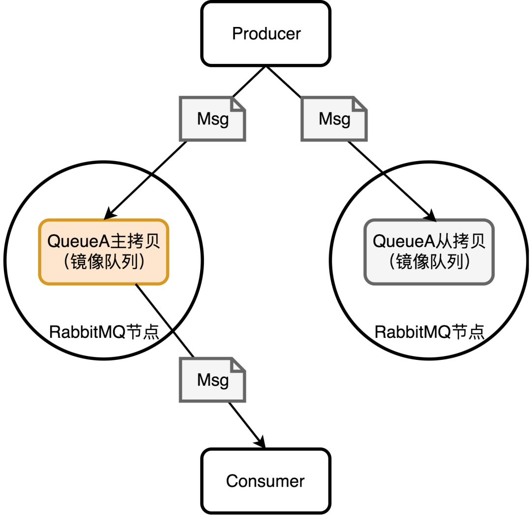 除了发送消息,所有的操作实际都在主拷贝上,从拷贝实际只是个冷备(默认的情况下所有RabbitMQ节点上都会有镜像队列的拷贝),如果使用消息确认模式,RabbitMQ会在主拷贝和从拷贝都安全的接受到消息时才通知生产者。