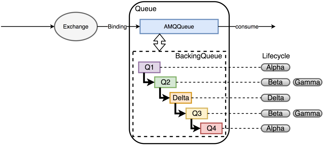BackingQueue由Q1,Q2,Delta,Q3,Q4五个子队列构成,在Backing中,消息的生命周期有四个状态: