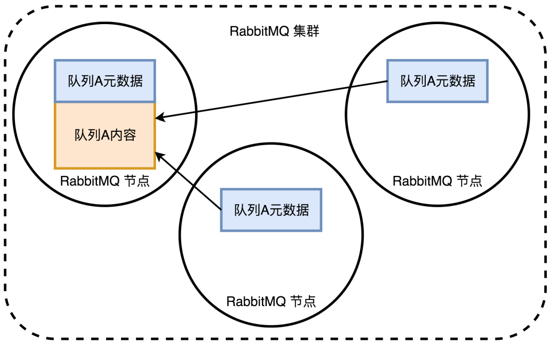 如上图所示,队列A的实例实际只在一个RabbitMQ节点上,其它节点实际存储的是只想该队列的指针。