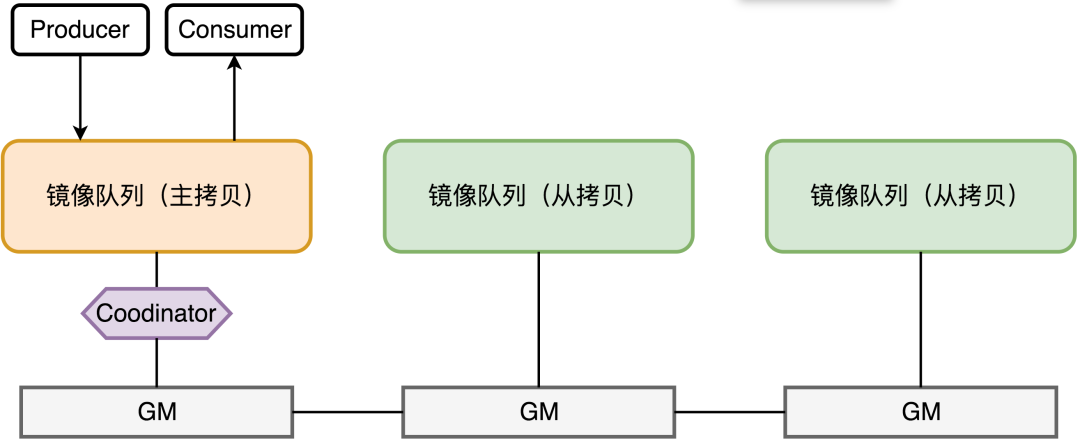所有对镜像队列主拷贝的操作,都会通过Guarented Multicasting(GM)同步到各个Salve节点,Coodinator负责组播结果的确认。