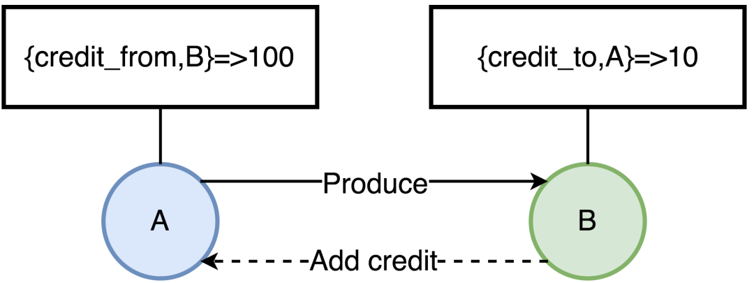 如图所示,A进程当前可以发送给B的消息有100条,每发一次,值减1,直到为0,A才会被Block住。B消费消息后,会给A增加新的Credit,这样A才可以持续的发送消息。这里只画了两个进程,多进程串联的情况下,这中影响也就是从底向上传递的。