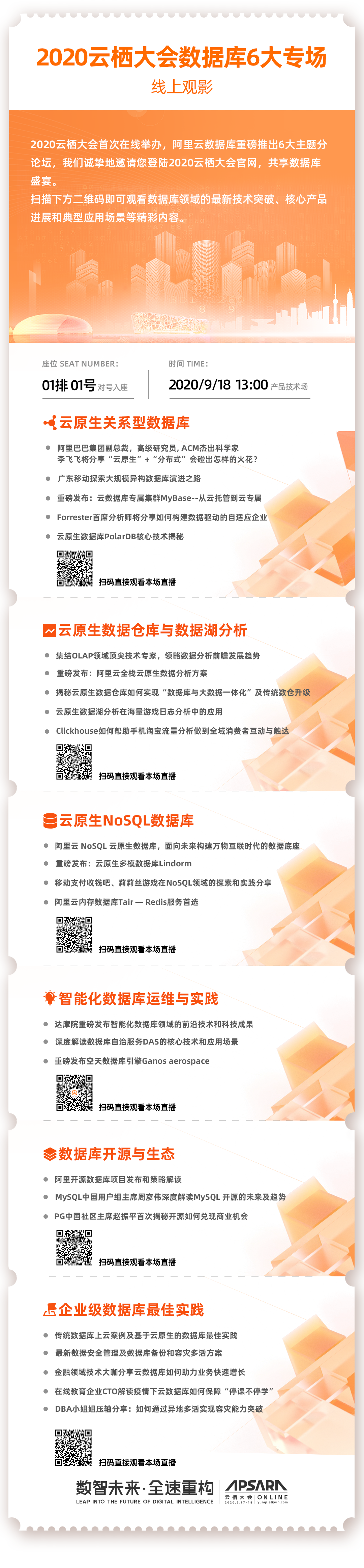 2020云栖大会于9月17-18日首次在线举办。阿里云数据库将于9月18日13点重磅推出6大主题分论坛,数十位业内顶级专家、行业客户和分析员现身直播,期待与大家共同分享、交流、提高、解惑。
