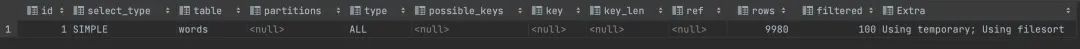 Extra中Using temporary表示使用临时表,Using filesort表示需要执行排序操作。