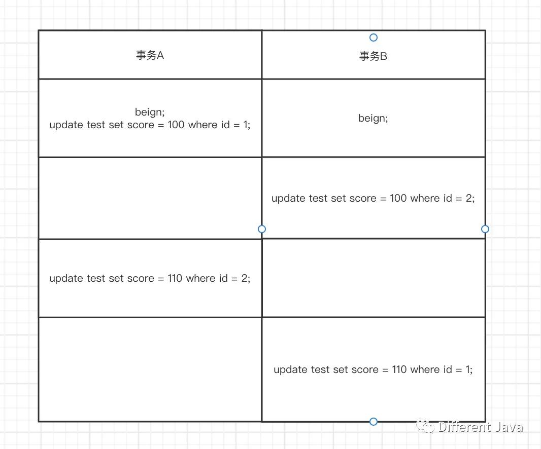 上图中事务A在等待事务B释放id=2的行锁,而事务B又在等待事务A释放id=1的行锁,两个事务之间形成死锁。