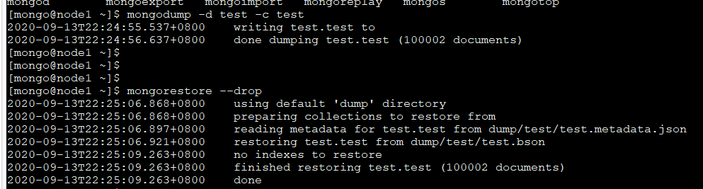 [mongo@node1~]$ mongod -f etc/mongodb/mongodb1.conf ---shutdown##停止临时数据库,否则在导入的时候会报资源忙