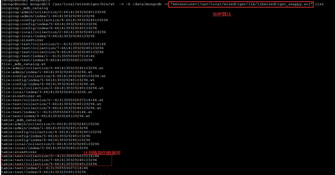 wt -v -h data/mongodb -C"extensions=[/usr/local/wiredtiger/lib/libwiredtiger_snappy.so]"list –列出所有的对象名称,由于WT引擎默认使用了snappy压缩算法,所以需要使用extensions显示指定类文件位置。