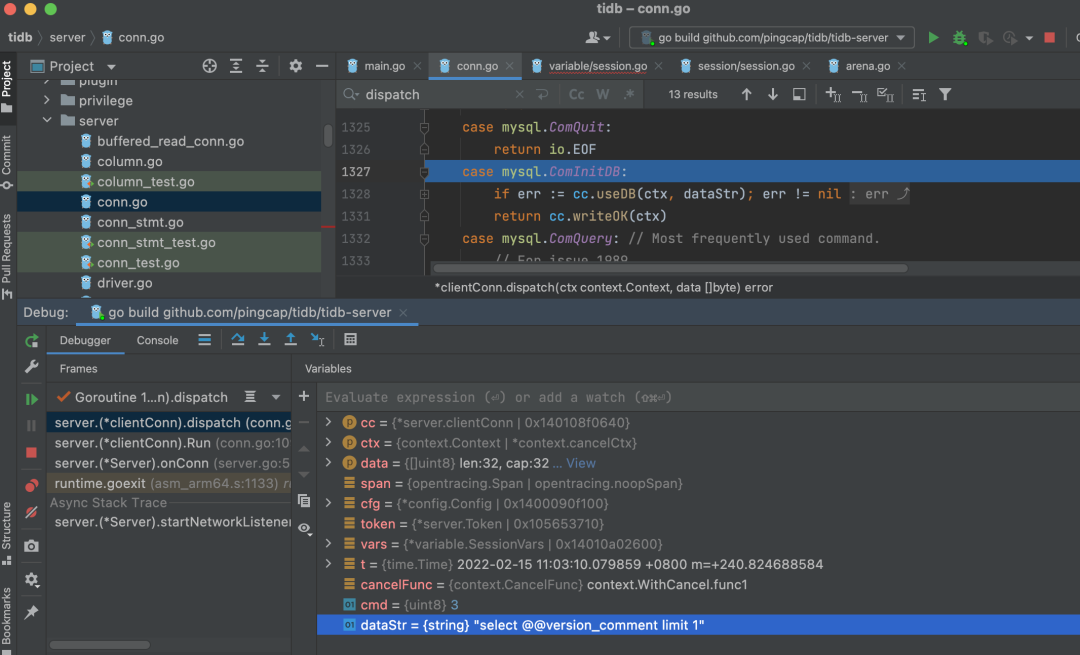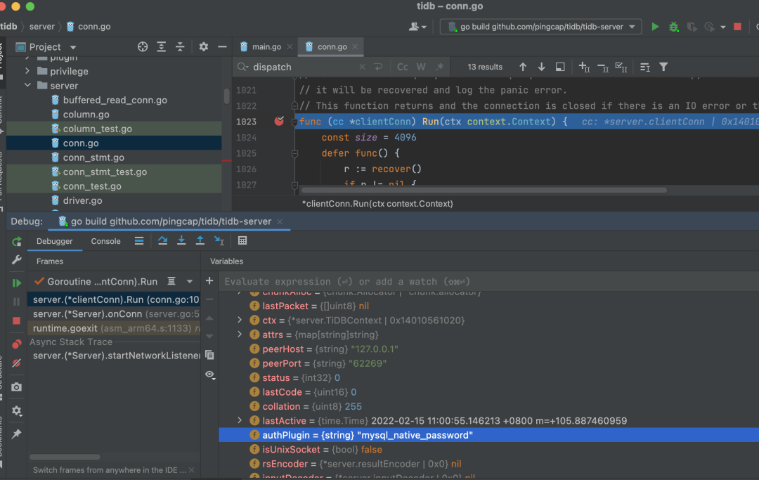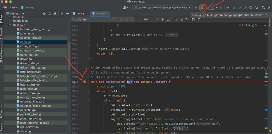上述的环境配置完成之后,就可以编译和调试了。我们随便找个地方打一下断点。这里选择了conn.go的Run函数上设置断点。