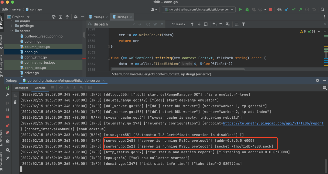 可以看到Console中显示TiDB-Server已经编译成功并启动。