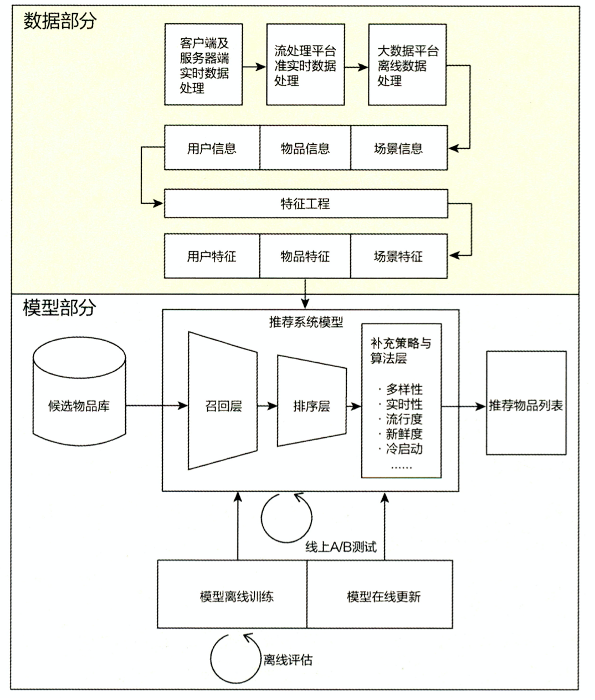 推荐系统的架构已在多本书籍与多篇文章中被提及,而较为经典的流程描述之一如图1 所示。从图中我们可知,一个推荐服务包括几个模块:推荐池、用户画像、特征工程、召回、排序、策略等。整个推荐流程中,召回处于整个环节的第一环,它从整体内容池中圈定了一个子集,供推荐系统从中再择优吐出至用户面前。从这个角度而言,召回候选集的好坏,从很大程度上决定了推荐的整体好坏,召回的重要性也就不言而喻。
