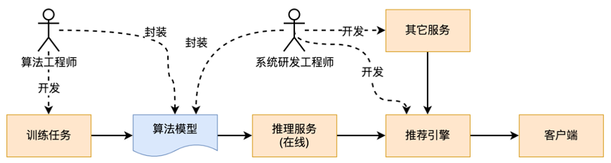 在业务开发中,作为工程师都知道,单一服务于某个业务与同时向多个业务服务,所要考虑的点是有较多不同的,后者需要更多的抽象与通用性,而这也是推荐中台要解决的问题,只有这样,才能提升服务搭建的效率,解放人力用于更多的业务思考当中,而不是重复工作。在一个推荐系统的研发过程中,往往需要算法工程师与系统研发工程师的紧密协作,前者的职责是基于业务实现可用的算法模型,而后者的职责,一者是协同算法工程师将模型封装服务化,二者是开发推荐引擎及其它依赖子服务将整个推荐流程进行串联,供下游调用推荐接口,如图3 所示。