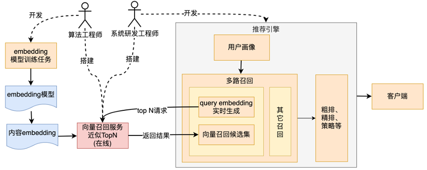 我们可以看到,模型的不断更迭,都是为了能加强特征组合与选择,以及整体泛化能力的强化,而随着深度学习浪潮的兴起,这些问题又进一步被推进,深度学习可以使得模型同时具备记忆能力与泛化能力。⚠️ 注:记忆能力可以理解为模型直接学习并利用历史数据中物品或者特征的共现频率的能力;泛化能力可以理解为模型传递特征的相关性,以及发掘稀疏甚至从未出现过的稀有特征与最终标签相关性的能力。深度学习的流行与 embedding 技术的发展,使得 embedding 具备了综合信息的能力强、能将高维稀疏特征向量转换成低维稠密特征向量、能通过向量运算揭示内容及用户相似度等特点。embedding 本身也是极其重要的特征向量。embedding 自身表达能力的增强使得直接利用 embedding 生成推荐列表成了可行的选择。因此,利用 embedding 向量的相似性,将 embedding 作为推荐系统召回层的方案逐渐被推广开来。以下图2 是 YouTube 推荐利用 embedding 进行候选物品进行召回的做法。对于 embedding 的算法模型有很多,如对 embedding 具有奠基性意义的 Word2Vec,基于 Word2Vec 在推荐领域推广出来的 Item2Vec,亦有广义的 Item2Vec(如 DSSM 双塔模型),也有引入了更多结构信息的图嵌入技术的 graph embedding(如 DeepWalk,Node2vec,EGES等),其对应的实现也有较多论文与文章讲述,因此本文中我们对算法模型不再过多讲述,而是将焦点置于工程上如何能快速部署在线向量召回服务,并能让推荐引擎在线上高效访问,也就是图2 的工程化落地实现。 在线向量召回服务化实践