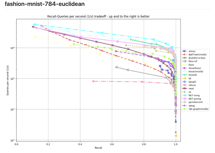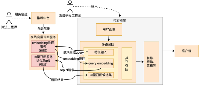 在此服务封装与实现下,业务同学要创建在线向量召回服务时可达到无门槛分钟级创建,且支持在线调试。在 Milvus(2核 6G)& dubbo 查询服务(4核 12G)8*8 实例下,对 600w * 64 维数据进行查询,当查询 QPS 在 3k时,p99 延迟在 20ms 左右。而业务同学的接入流程亦如图9 所示,不需要再封装与搭建向量召回服务。在上述服务化实现中,做到了服务的通用化抽象,当在一个业务中,推荐系统开发人员要接入一个在线向量召回服务时,可以在平台上通用自助操作后,在分钟级就能获得一个服务并暴露一个通用接口供推荐引擎调用。但细心一点会发现(可以参考图9),在向量召回过程中,查询 query 的向量生成并没有包含到服务中,仍然在推荐引擎模块中。而 query 向量的生成方法,一种较为简单的方式为可根据业务特点通过规则或简单算法对已有相关 embedding 进行加权生成,另一种就是利用 embedding 生成模型,在提供输入特征后实时生成。显然,将 query 向量的生成包含在服务中,无论是对于解放业务同学而言,还是对于整体推荐服务构建效率提升而言,都是比较重要的。在对整体方案与选型进行了再评估后,首先对于 0-1 的快速实现,选择成熟封装好的 ANN 服务性价比是比较高的,这也是最终选择 Milvus 框架的原因之一。而随着服务建设的持续推进,后续对性能、功能的优化速度与契合度有较多考量,类似于 YouTube DNN 这种在线向量召回,希望把推理与召回封装到一起,如果基于 Milvus 数据库会涉及到新功能的依赖以及与社区迭代计划的匹配,与现阶段的内部诉求不一定一致。另外在之前的实践过程中,我们发现 Milvus 还有一定的问题存在,当然 Milvus 社区也比较活跃,所存在的问题也在逐步解决。但在综合评估之后,我们决定联合爱奇艺深度学习平台,基于 hnsw lib 进行改造。之所以可以进行快速切换,主要原因有:(1)爱奇艺深度学习平台对 hnsw lib 进行了封装,并产出了一套类似于Milvus 数据库的服务,并在快速迭代升级;(2)基于 hnsw lib 封装的服务在索引创建时,服务依然可用,可以解决 Milvus 在索引创建时,cpu load 较高而查询不可用问题,也能简化整体设计;(3)基于hnsw lib在实现类似YouTube DNN的在线推理召回一体化时相较于milvus较为便捷(我们应该是轮子的使用者,而不是重复造轮子的人,除非已无轮子可用);(4)hnsw 的 ann 算法实现在效果上表现最好,如图10 是在 2020-07-12 在 fashion-mnist-784-euclidean 数据集上的测试结果,越往右越靠上代表效果越好;(5)在图6 的设计过程中,我们基于 Milvus 数据库作为底层镜像向上构建应用,并在设计之初也保留了将来对其切换为其它服务框架的考虑,因此,对 Milvus 进行切换具有可行性。图10 2020-07-12在fashion-mnist-784-euclidean数据集上的测试结果为了将向量的在线推理部分纳入进来,我们需要将模型的训练部分进行接管,但考虑在实现上,算法工程师需要保留其自主修改算法的权利,因此在模型服务层面会支持其选用中台内置模型或使其按照中台定的规范去自实现算法。在原来的整体架构上进行一定调整后,在线推理及召回一体化的设计如图11 所示。在对整体方案进行调整后,向量召回服务的接入过程如图12所示,此时,推荐引擎内部不需要关心 query embedding 向量的生成实现过程,其只需提供需要的特征即可。图12 在线embedding推理召回一体化实现后的接入过程