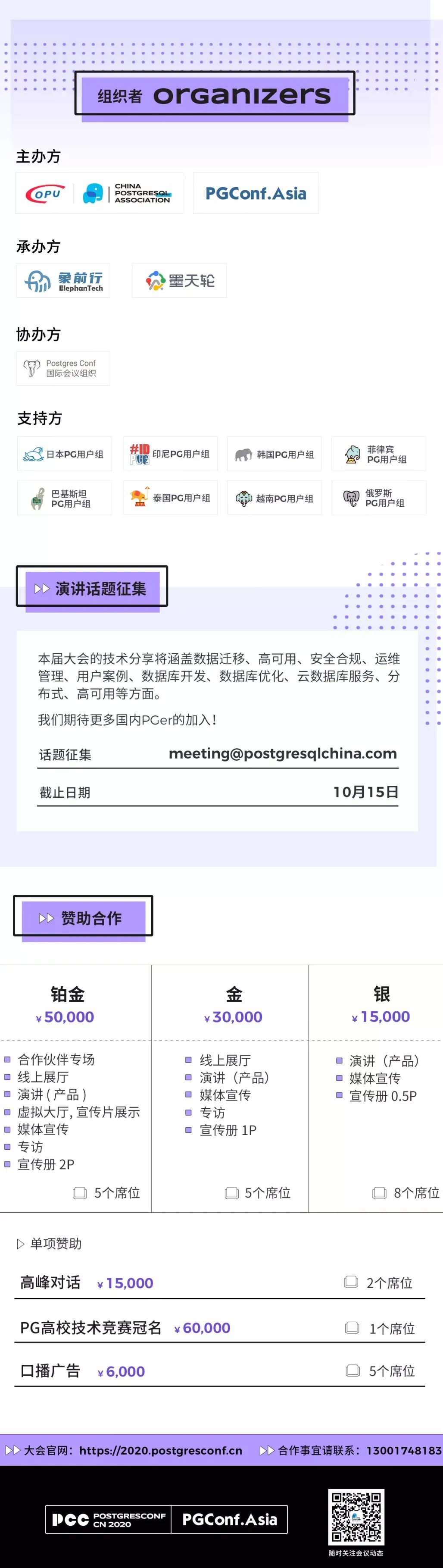 作为全球最大、最知名的PG序列会议,从纽约到莫斯科,从里约热内卢到约翰内斯堡,全球各地区都有PGConf在运行。而亚洲规格最高的PG技术盛会—PGConf.Asia大会,将于今年11月首度在中国举行。中国开源软件联盟PG分会作为东道主承办本次会议,采用”线上线下结合“的形式,通过墨天轮社区面向全球直播,本次大会将集中国PG力量和亚洲主要PG贡献者、应用企业共同打造亚洲范围内最大规模的PG生态会议。