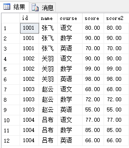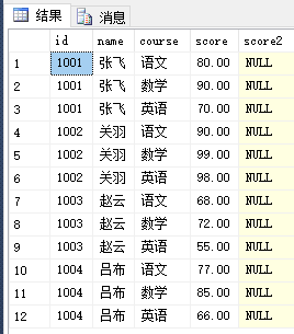 1、通过同一表内update复制列到另一列,如下图所示,在原表增加列score2,且把score的值复制过来