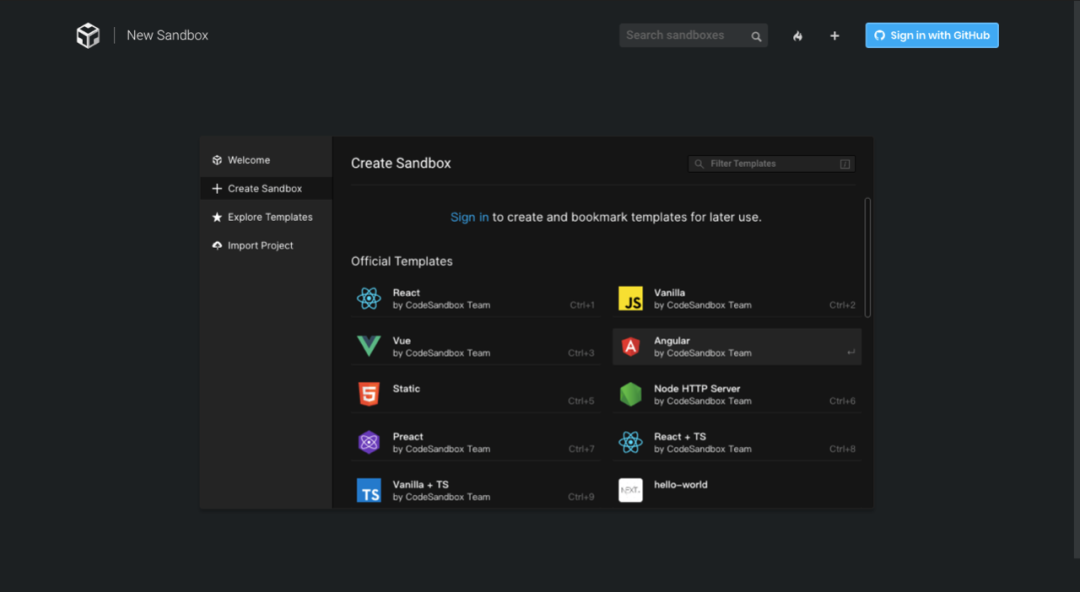 站如其名,CodeSandBox 网站提供一个在线开发环境的“沙盒”,主流的框架如 React、Vue、Angular 等,都可即开即用、实时编译预览,非常方便。