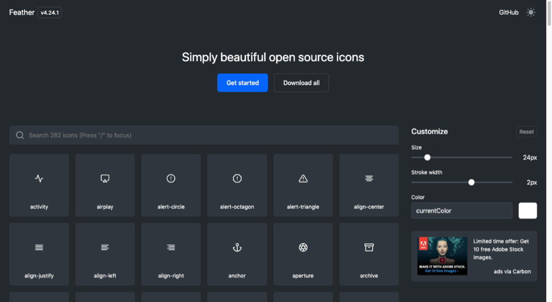 是一个在线可自定义设计SVG图标素材的网站,帮助前端设计师找到想要的图标素材,这些图标素材都是常用图标,可以点击官方提供的素材进行二次设计,同时也可以把设计好的图标导出。