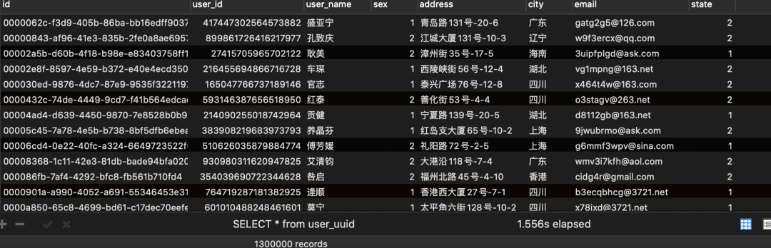 package com.wyq.mysqldemo;import cn.hutool.core.collection.CollectionUtil;import com.wyq.mysqldemo.databaseobject.UserKeyAuto;import com.wyq.mysqldemo.databaseobject.UserKeyRandom;import com.wyq.mysqldemo.databaseobject.UserKeyUUID;import com.wyq.mysqldemo.diffkeytest.AutoKeyTableService;import com.wyq.mysqldemo.diffkeytest.RandomKeyTableService;import com.wyq.mysqldemo.diffkeytest.UUIDKeyTableService;import com.wyq.mysqldemo.util.JdbcTemplateService;import org.junit.jupiter.api.Test;import org.springframework.beans.factory.annotation.Autowired;import org.springframework.boot.test.context.SpringBootTest;import org.springframework.util.StopWatch;import java.util.List;@SpringBootTestclass MysqlDemoApplicationTests { @Autowired private JdbcTemplateService jdbcTemplateService; @Autowired private AutoKeyTableService autoKeyTableService; @Autowired private UUIDKeyTableService uuidKeyTableService; @Autowired private RandomKeyTableService randomKeyTableService; @Test void testDBTime() { StopWatch stopwatch = new StopWatch("执行sql时间消耗"); /** * auto_increment key任务 */ final String insertSql = "INSERT INTO user_key_auto(user_id,user_name,sex,address,city,email,state) VALUES(?,?,?,?,?,?,?)"; List<UserKeyAuto> insertData = autoKeyTableService.getInsertData(); stopwatch.start("自动生成key表任务开始"); long start1 = System.currentTimeMillis(); if (CollectionUtil.isNotEmpty(insertData)) { boolean insertResult = jdbcTemplateService.insert(insertSql, insertData, false); System.out.println(insertResult); } long end1 = System.currentTimeMillis(); System.out.println("auto key消耗的时间:" + (end1 - start1)); stopwatch.stop(); /** * uudID的key */ final String insertSql2 = "INSERT INTO user_uuid(id,user_id,user_name,sex,address,city,email,state) VALUES(?,?,?,?,?,?,?,?)"; List<UserKeyUUID> insertData2 = uuidKeyTableService.getInsertData(); stopwatch.start("UUID的key表任务开始"); long begin = System.currentTimeMillis(); if (CollectionUtil.isNotEmpty(insertData)) { boolean insertResult = jdbcTemplateService.insert(insertSql2, insertData2, true); System.out.println(insertResult); } long over = System.currentTimeMillis(); System.out.println("UUID key消耗的时间:" + (over - begin)); stopwatch.stop(); /** * 随机的long值key */ final String insertSql3 = "INSERT INTO user_random_key(id,user_id,user_name,sex,address,city,email,state) VALUES(?,?,?,?,?,?,?,?)"; List<UserKeyRandom> insertData3 = randomKeyTableService.getInsertData(); stopwatch.start("随机的long值key表任务开始"); Long start = System.currentTimeMillis(); if (CollectionUtil.isNotEmpty(insertData)) { boolean insertResult = jdbcTemplateService.insert(insertSql3, insertData3, true); System.out.println(insertResult); } Long end = System.currentTimeMillis(); System.out.println("随机key任务消耗时间:" + (end - start)); stopwatch.stop(); String result = stopwatch.prettyPrint(); System.out.println(result); }