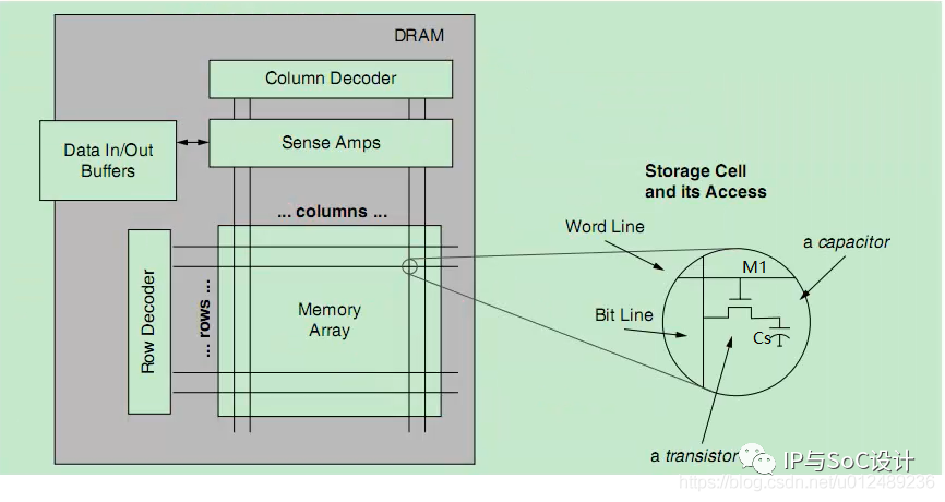 对于DRAM,其主要由行和列组成,每一个bit中都是由类似右下图的类晶体管的结构组成,对于sdram的数据,可以通过控制column和row就可以访问sdram的随机地址的内容。