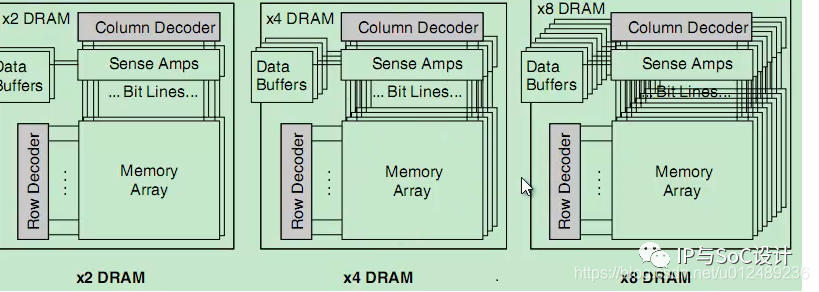 由上面可以看出一个位只能表示一个bit,那么我们想读取多个位的时候,该怎么办呢?那就出现了ddr中的bank的概念,由多个memory array就组成了一个bank,如下图,一次可以读取2bit/4bit/8bit的数据: