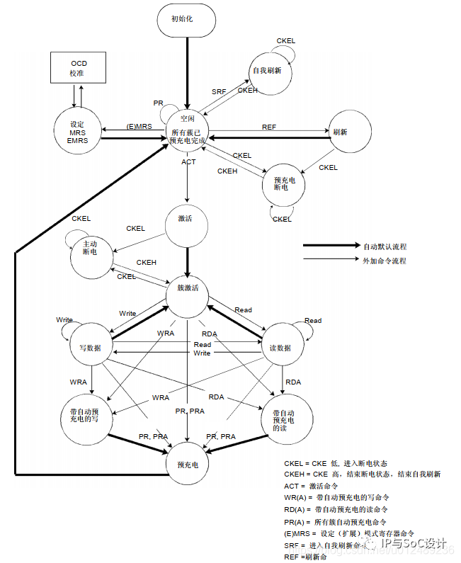 对于一款ddr,我们需要知道通过什么样的方式来控制完成我们需要,我们来看看ddr的状态,ddr的工作就是在这几个状态之间切换: