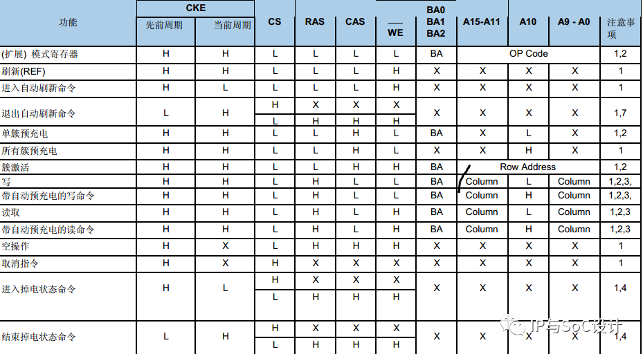 DRAM的基本命令是通过操作各种控制信号/地址信号的组合来完成,下表是DRAM的命令表: