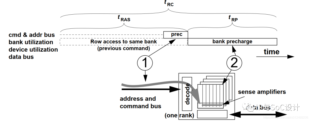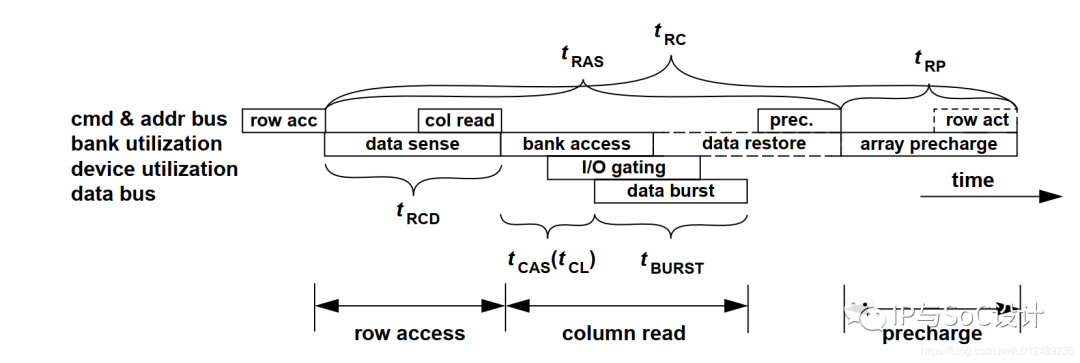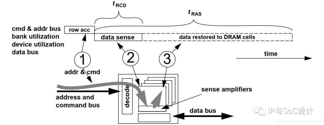 ·in bank data movement: 在这个阶段,第一阶段发送需要读取的 Column 的地址给 DRAM。然后 DRAM 再将 Active Command 所选中的 Row 中,DRAM 就将 Memory Array 中的数据从 DRAM Cells 中读出到 Sense Amplifiers,或者将数据从 Sense Amplifiers 写入到 DRAM Cells。